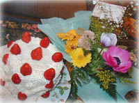 2002/02/10(Sun)(o^v^o)エヘヘ ![]() ヾ(@⌒▽⌒@)ノ彼からの一足早い誕生日プレゼントのブーケと 2人で一緒に作った誕生日ケーキですぅ♪(〃∇〃)テレッ☆ 早起きした彼が家に着く直前に佐○急便でブーケが届きました♪ ブーケ…って言うか、アレンジ・フラワー?(^^ゞ 白いタワシのような素材で出来た『うさぎちゃん』が2匹いたり ピンクと白と紫のアネモネ&黄色いガーベラが早春なのです♪ お花の包装(繊細な籠のような覆いがされてた)を解いて 一休みしたあとで、お買い物にGO☆彡 『2人で誕生日ケーキを作ろうね』って・・・(^^ゞ で、小さめの苺と生クリームと・・・もこもこ..(((o≧∇≦)o スポンジは『もこもこ』にしちゃってみようと言う事で・・(爆) 折しも『Valentine直前の連休』と言う事で 製菓材料はふんだんな品揃えヽ(・ω・)ノ この点は「ValentineがBirthday」って便利だよぉ♪(笑) でも・・・売れ行きも想像以上!! 『もこもこ』なんてラスト1個だったもんね。。 まぁ、既成のスポンジも沢山売ってたけど、 例え「電子レンジでチン☆」のもこもこでも 手作りOKってね♪ で、お買い物の帰りに、夕食を・・・ 一足早い『Valentine』&『Birthday』のぢなーって事で ステーキヽ(*・ω・)人(・ω・*)ノ ちょっと贅沢しちゃってみました♪(*^^*ゞ 車だったし、彼=呑めないからワインで乾杯・・は無し(≧ω≦) 帰って来てから、夜にケーキ作りスタート☆彡 『もこもこ』は すっごーーーく楽チンで簡単だったでし! もう少しシットリ…の方が好みかも・・なんだけど (ウチの電子レンジのパワーが強かったのかも・・(謎)) まぁ、この手軽さを考えたら合格だよね!! ケーキ作りで一番大変なのがスポンジだもぉ。。(;^_^A もこもこスポンジが冷える間に、 生クリームを泡立てて=彼が担当(但し 電動…でし♪) 苺を選んだり切ったり=あっこ担当 生クリームが頑張っちゃって、ちょっと立て過ぎちゃったよ。 8分立て・・越えて、限りなく10分立てに近づいちゃった(^^ゞ さて・・・いよいよ飾り付け☆彡 ふわふわスポンジに対して、固めの生クリームを塗るのが大変! 2人でギャーギャーヾ(≧∇≦)〃キャーキャー!! 彼ったら、あっこが必死にしてるのを見て、 「自分の誕生日ケーキなのに・・・」とか 「この事を どんな風に日記に書くのかなぁ」って 笑い出しちゃうし・・・ε=(>ε<)プッー! で、どうにかこうにか出来あがったのが↑の写真です♪(^^ゞ 大成功!!<( ̄^ ̄)> ・・とは言えない出来だったけど でも、とっても楽しくて幸せなケーキでした♪ きっと一生忘れないケーキ作りになるんだろうね♪♪ 毎年 一緒に作って行けたら良いなぁ。。って思うよ(〃∇〃) |
