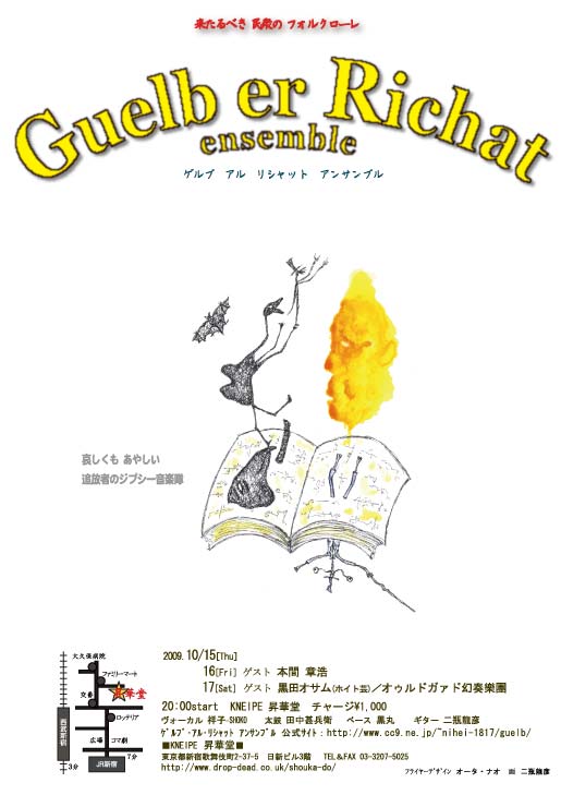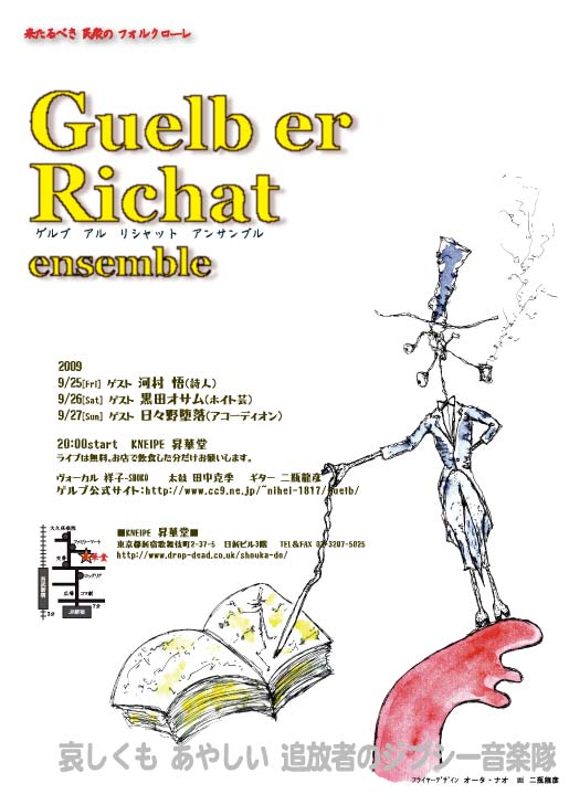 2009年9月6日[Fri] 阿佐ヶ谷 名曲喫茶 ヴィオロン 2009年9月25日[Fri],26日[Sat],27日[Sun] 25日ゲスト:河村悟(詩人) 26日ゲスト:黒田オサム(ホイト芸) 27日ゲスト:日比野堕落(アコーディオン) KNEIPE 昇華堂 |