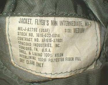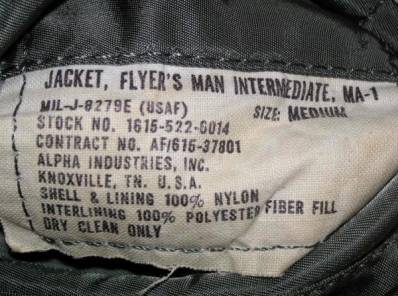 左が初期のALPHA社製民間品MA-1のラベルで、右がCONCORD社製民間品MA-1のラベルです