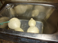 31日 台風16号がものすごかった。今までの苦労が水の泡になると思ってかなり心配していたけど、どうやら何事もなくて一安心。 9月7日また大型台風がくるらしい。心配だ…。前回といい今回といい「りんご台風並の大きさ」という。 りんご台風がどんなものだったか正直忘れたが、青森のりんごが軒並み倒されたんだろう。 未だ大瓢を採っていない私にとっては「ひょうたん台風」にならないことを願うばかり。 14日 暑い。暑さ寒さも彼岸までっていいてた人って誰だ? そろそろ収穫と思っていた国東一がまだ収穫していない。ホントそろそろ収穫しなくては…。 そういえば、千成もまだ入浴中だった。 20日 やっと、国東一を収穫した。 千成も十分腐ってくれたので、種抜きをした。 わかっていたけど相変わらず臭い。しかも千成の数が自分史上最も多かったので、種抜きがつかれた。 特に9ミリ穴で漬けたのやつは種が本当に取れない。途中で「種有りもまた一興」と妥協してしまった…。 国東一のサイズは家庭瓢園レベルでは大きすぎたようで、(といっても胴回り1メートルほどだけど…)うちにある一番大きいポリバケツ(60リットル)に入らなかった。急遽風呂桶を調達してきた。ステンレス製の風呂だからやばいかもしれない…。