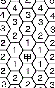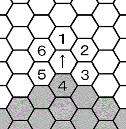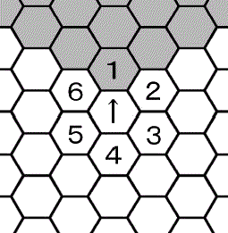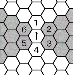 距離について 距離も向きと同じように重要です。特に射撃戦を行うのなら距離はしっかりと数えられなければなりません。 ヘクスの数え方 甲からの距離が数字で表されています。