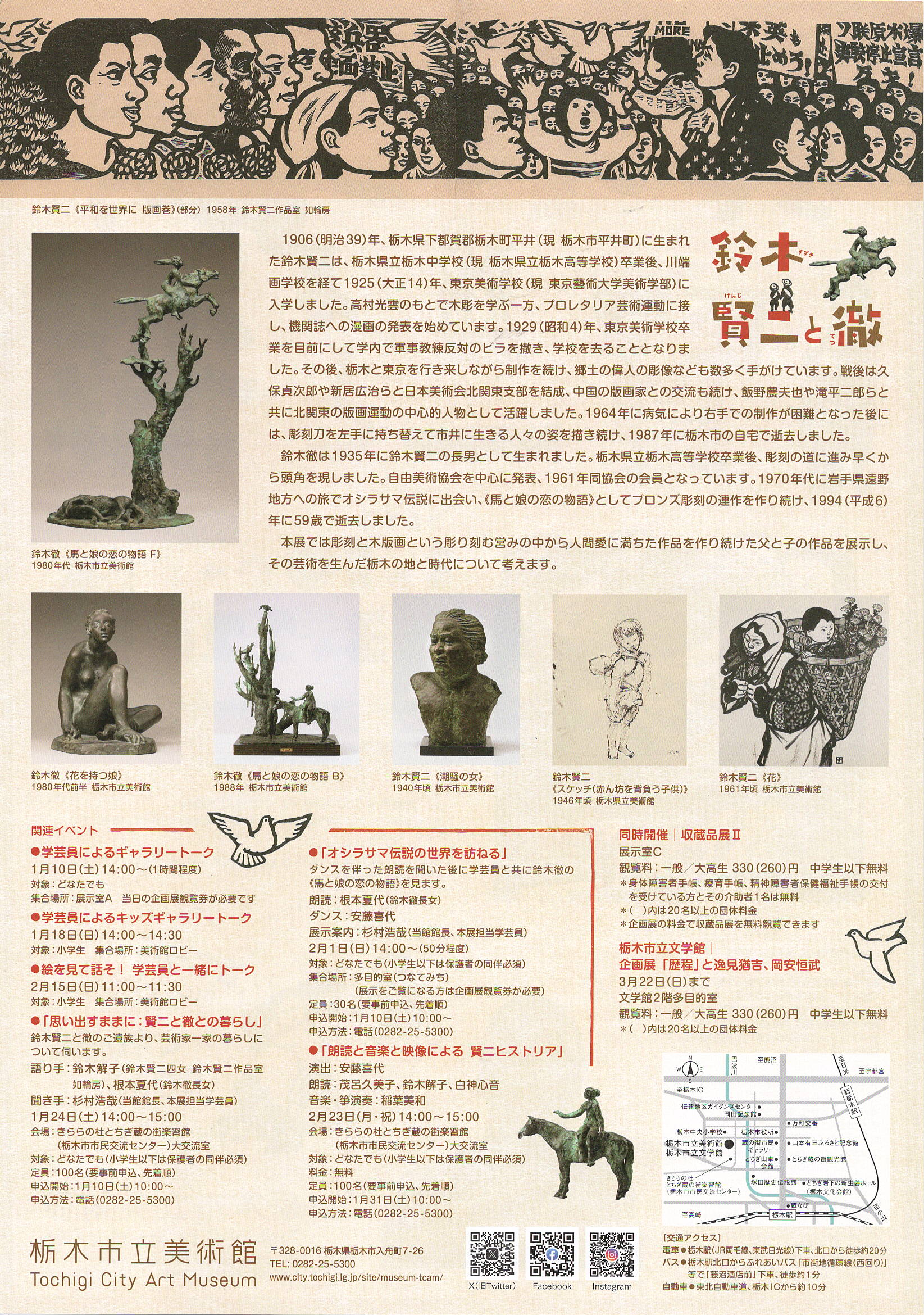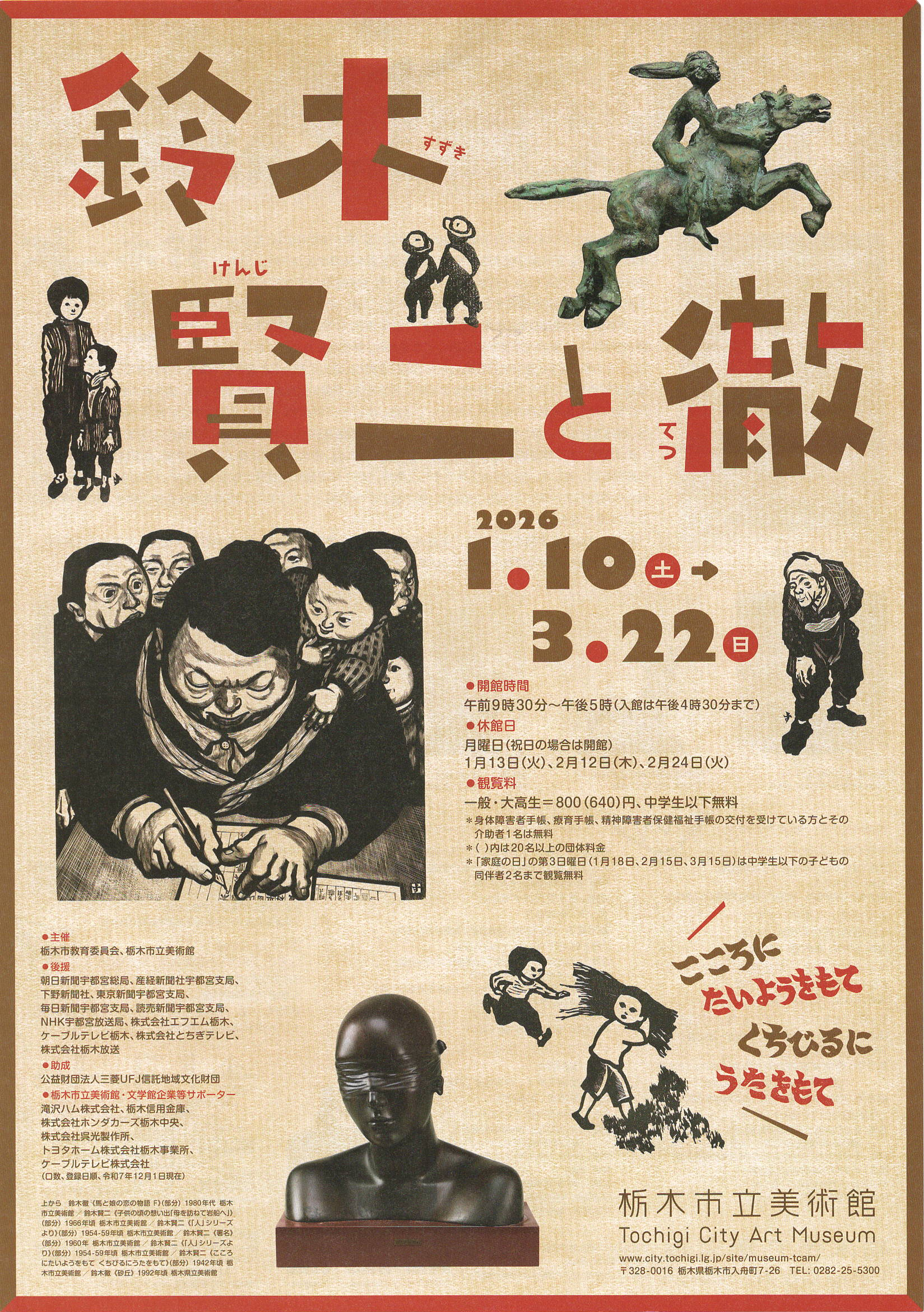 (前略)鈴木賢二(1906年~1987年)は市井の人々をいきいきと描き続け、版画家として、彫刻家として、そして漫画家として、昭和という困難な時代を駆け抜けました。その優れて前衛的な造形は、近代美術史の中でも存在感を示しています。