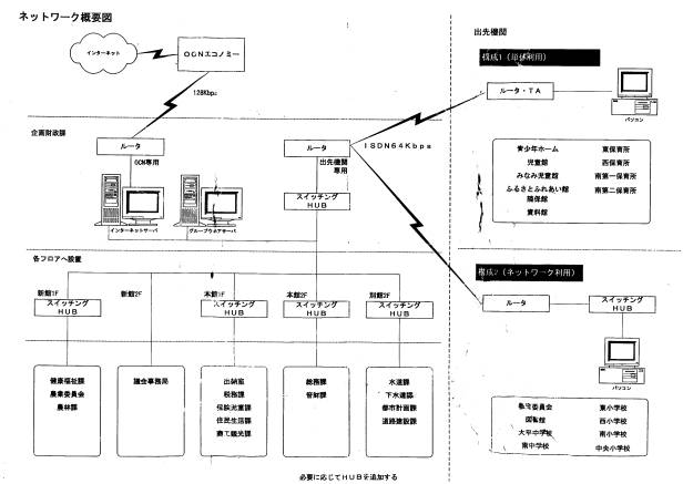 128kbpsの専用線で接続し、そこから各出先機関へ64kbpsで接続する。