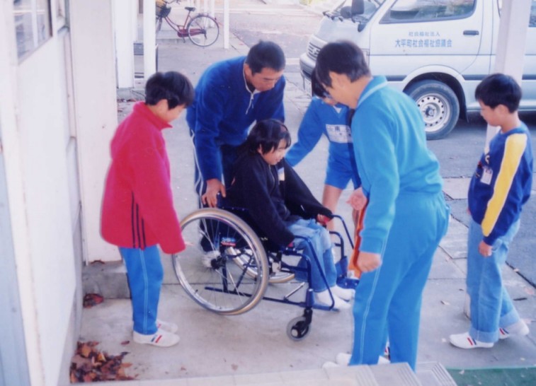 車いすや「未来ちゃん」を使っての疑似体験を通して,障害者の問題や高齢者の