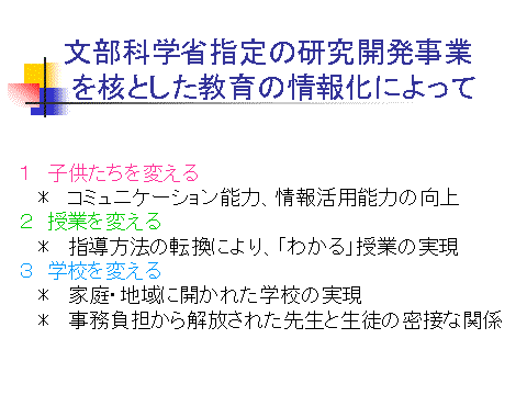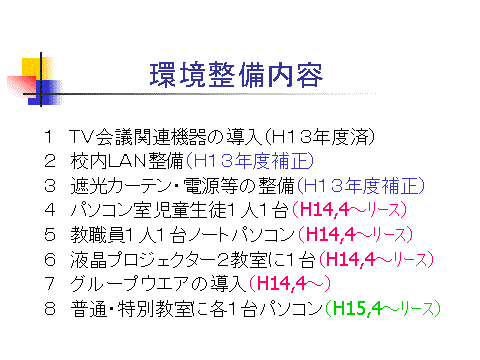 国分寺町小中学校教職員IT研修計画 1 研修内容 (1)Windowsとインターネットの基本操作 (2)一太郎の使い方 (3)ワードの使い方 (4)エクセルの使い方 (5)インターネット、Eメール、インターネット忍者の使い方 (6)パワーポイントの使い方 (7)校内LAN及びキッズウェアの使い方 *キッズウェアについては日興通信(株)が行う。他は(株)日立エレクトロニクスが行う。 2 対象 小中学校教職員のうち研修参加希望者。1つの研修内容について2回開催しますので 日程上都合の良い方へご参加ください。(両方に参加しても結構です。) 3 研修時間 <平日>午後3時45分から4時45分までの1時間です。ただし、さらに詳しく知りたい方は、 最大限1時間の延長は可能です。 <夏休み中>午前中2時間30分、午後2時間30分行います。 4 研修日・・・要検討 *中学校の定期テスト中の放課後 *夏休み中の県の研修等のない日(土日含む。ただし土日に研修した場合、夏休み中に振り替え で休日を取ってください。) *校内LAN及びキッズウエアの使い方については、春休み中に1回研修時間を設ける。 |