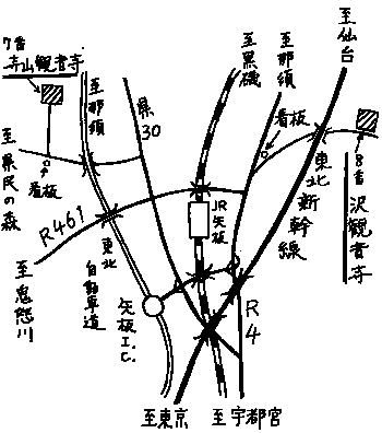 梅雨の晴れ間の日差しの眩しい1日、車でお参りさせていただきました。矢板市街から県道30号線を2kmほど北上し、下太田の交差点を左折して西へ向かいさらに2kmほど進むと、のどかな田園風景の中、寺山観音寺の案内板が見つかります。そこを右折しますと、そこは幅も狭く、杉並木に囲まれる林道がずっと続き、思わず道を間違ってしまったかと思わせられます。しかし3分ほど進むと、急に視界が開け、そこには堂々たる風格の伽藍が、青空と杉並木を背景に姿を見せてくれました。私達は「こんな山奥に!?」と、驚きとともに圧倒される思いでありました。