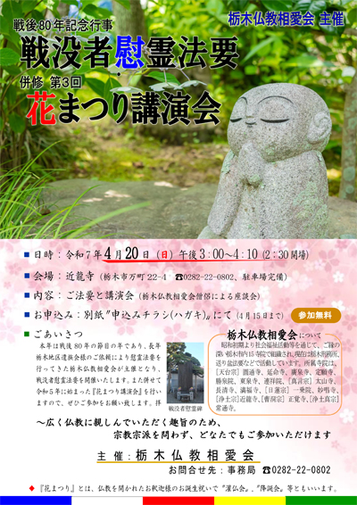 「たくさんの方に気軽に仏教に親しんで頂きたい!」そんな趣旨から、当山も所属する栃木仏教相愛会(栃木市中央部の超宗派15寺院の集まり)が主催となり、令和5年から花まつり講演会≠はじめました。 第3回となる今年は、戦後80年の節目として戦没者慰霊法要(約20分)と、相愛会の僧侶4名による仏教座談会(約45分)を行います。 広く仏教に親しんでいただく趣旨のため、宗教宗派は問わず、どなたでもご参加いただけます。また当日は『花御堂』を飾り、ご誕生時のお仏像に甘茶を降り注ぎ、皆様にもお釈迦様の誕生日花まつりをお祝い頂きたいと思います。 ぜひお誘い合わせのうえ、お気軽にご参加ください。 ◆ 名 称:戦没者慰霊法要 併修 花まつり講演会 ◆ 日 時:4月20日(日)午後2時30分より ◆ 会 場:近龍寺・本堂 栃木市万町22-4、電話0282-22-0802 ※お車は、境内および臨時駐車場へ ◆ 入場無料、ただしお申込みが必要 ◆ 申込方法:4月15日までに専用申込ハガキ、または 直接、当山寺務所にて受付(9時〜17時) ※ご送信いただきました個人情報は、講演会の開催以外の目的に使用する事はありません。
