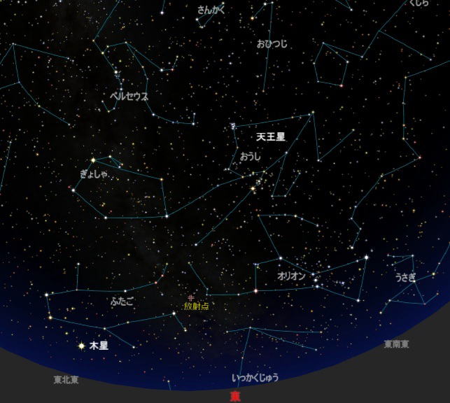 放射点が昇ってくる22時ごろから夜明けまで、流星を見るチャンスがあります。今夜でも、多少の流星は飛ぶと思います。