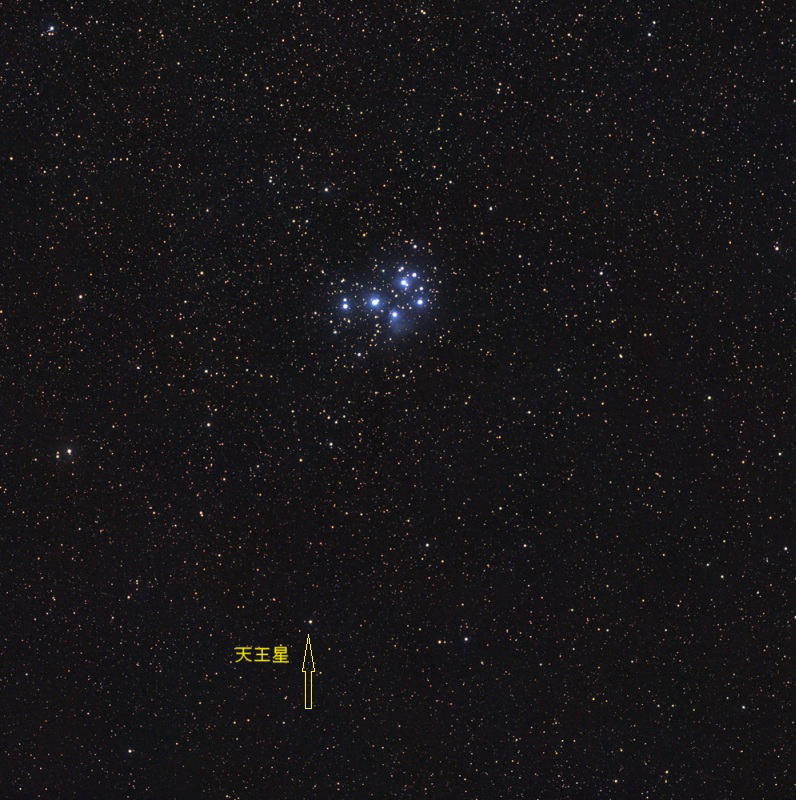 今はおうし座の中にあって、プレアデス星団(すばる)と並んでいるので、これを目印にして探してください。肉眼では見つけられませんが、双眼鏡を使うと比較的簡単に見えます。高倍率の天体望遠鏡で観察すると、青緑色に見えてきれいです。