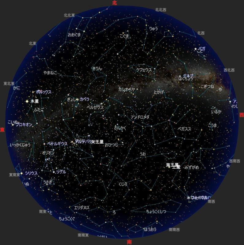どんな星座が見えるのかというと、下の図は今夜の20時の空です。