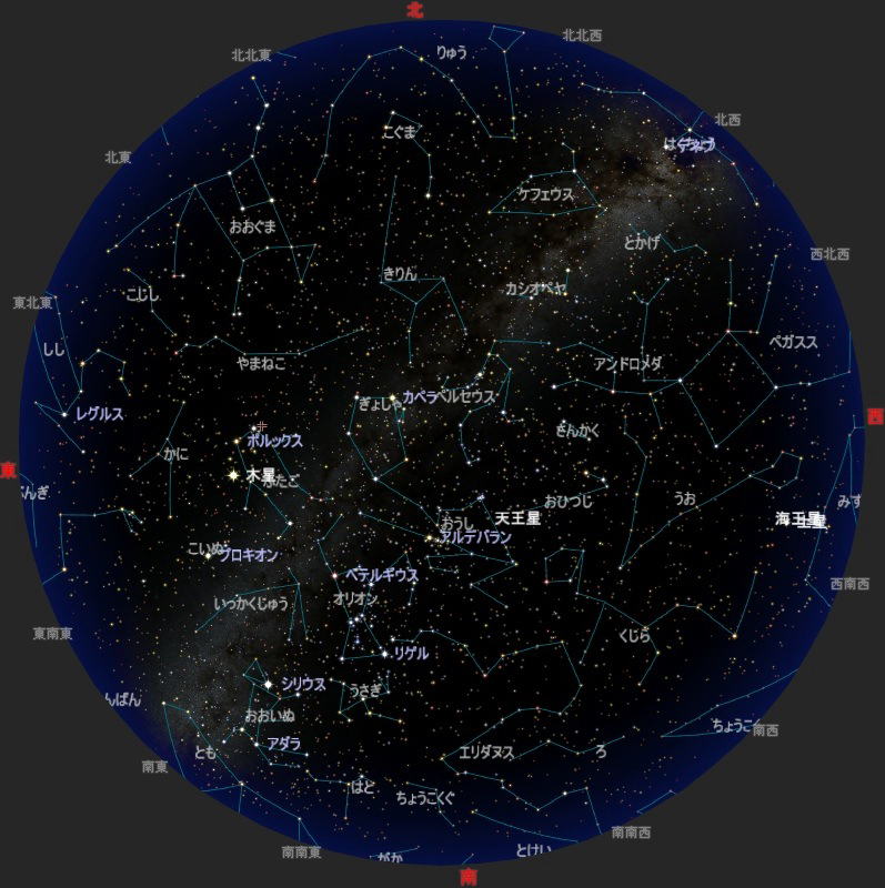 そのあたりから、ふたご座、こいぬ座、おおいぬ座までが冬の星座です。22時かそれ以降なら、冬の星座が全部見られます。