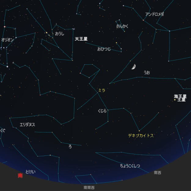 今週は、暗い天体や冬の天の川を見るのには良くないです。明るい星で構成される星座なら、月があってもなんとか見えます。そんな中で、今週から来週に見てもらいたいのは、くじら座です。