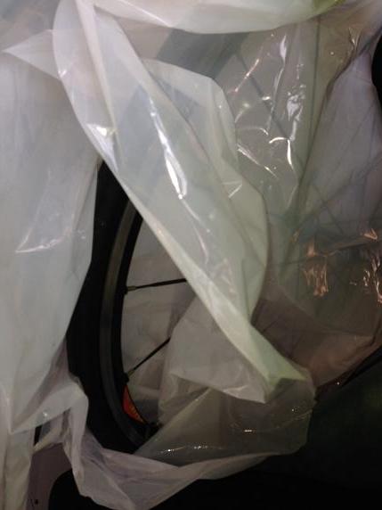 前輪だけ外し、ゴミ袋に自転車を突っ込み