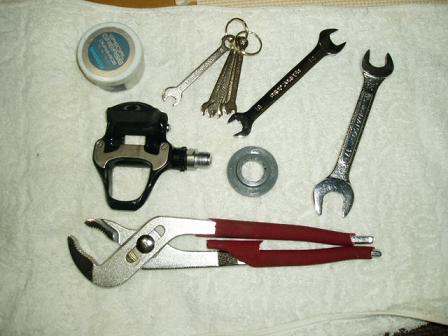 9月22日夜に意気揚々と分解しようと試みたが、 スパナのベアリングの玉押しナットとロックナットの サイズのスパナの手持ちが無く・・・ ペダルからシャフトを抜いてみた。 すると、グレーのグリスがべっとり。 これはもともとの色なのか? 古いグリスをちょっとふき取るレベルで終了。 それでも、ふき取る前とは若干回転が変わり くるくる程度となった。 これは何が何でも、最後まで分解清掃しなければ!! |