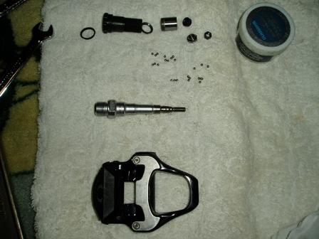 次は、組立です。 まずは、シャフトにデュラグリスをべったりぬります。 分解と逆に組み立てて行きます。 くれぐれも、部品が余らないように!! で、ベアリング球のセットは、 かなり小さいので、ピンセットがあったらよかったかな? ベアリングの締付け調整まで来ました。 ここは、各種HPを参考にしても、 感覚的なところなので、適当に締め付けを 調整してみる。 あまり締付けると、ゴリゴリって感触がある。 締付け過ぎないと、スルスルって感触・・・ で、 なんとなく、コロコロって当たっているけど、 スルスルっぽいかなぁ〜って感触で 締めてみた。 (これでいいのかはわかりません!) 最後、にペダルに差し込み、TD40で締付け。 これで、ペダル単体での完成です。 |