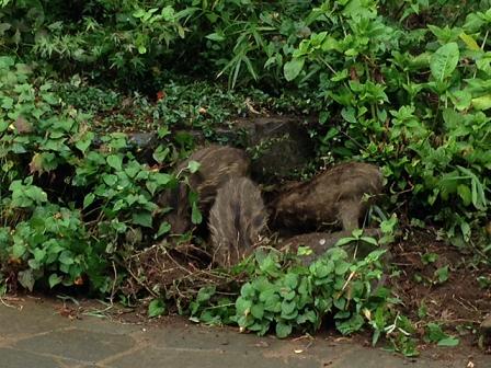 山頂付近のお茶屋さん前に、何やら人だかり。 どれどれとのぞいてみると、「ウリ坊」が3頭何か食べていた。