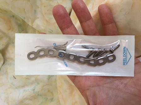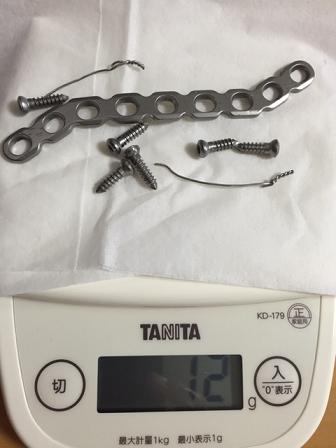 昨年6月に鎖骨を骨折してしまい、接合のためチタンプレートを体内に埋め込み補強をしていましたが、骨もくっついたので摘出手術を受けました。 13日 入院! 14日 摘出手術!! 16日 退院 体内から摘出されたチタンプレート一式です。 帰宅後、すかさず計量!!!! 数値は12gを指していますが、ティッシュが1gあったので 実質11gです。 なんて軽いのでしょう! さあ、今は鎖骨にネジの穴があいている状態なので、4週間は無理が出来ないかなぁ〜。 我慢出来るかな・・・・・・・。 |