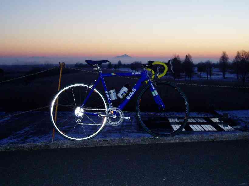 途中で引き返してきて、渡良瀬遊水地の土手の上から日の出を待ったが、なかなかでない。練習の服装でじっとしていたら凍えてしまうので、日の出も見れずに帰ってきました。↓
