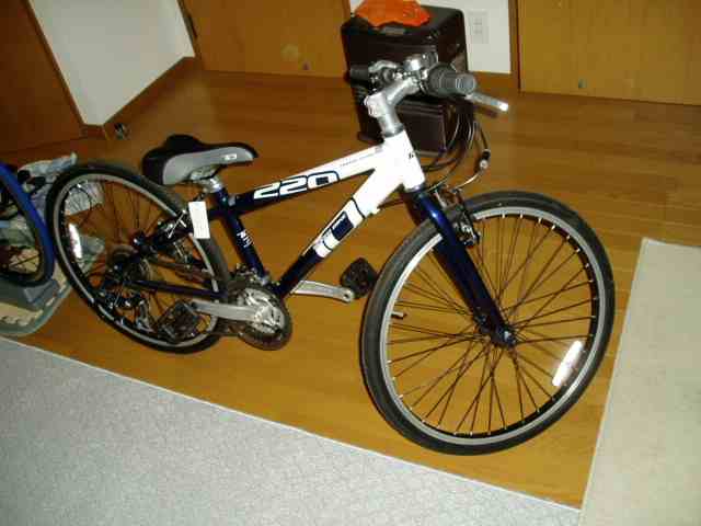 イオンで通常販売価格より1万円引きの19800円で22インチクロスバイクが、展示品チョイキズで売られているのに遭遇し、またとないチャンスと思い、入学祝ということで即購入。 さらに20日ということでイオンカードで5%オフ!うれしい限りでございます。 身長120cmあるかないかの彼には、ちょっと化かし大きいかと思いましたが、成長する予定なので・・・。 |