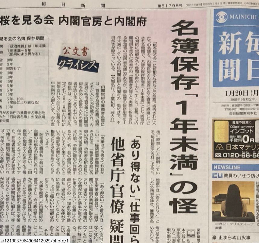 東京新聞、トップ記事も・・・東京新聞 2020年1月20日
