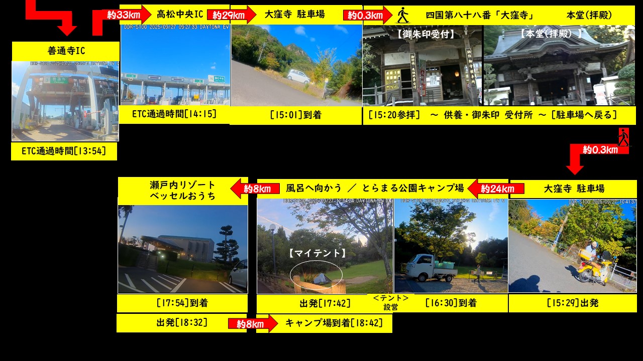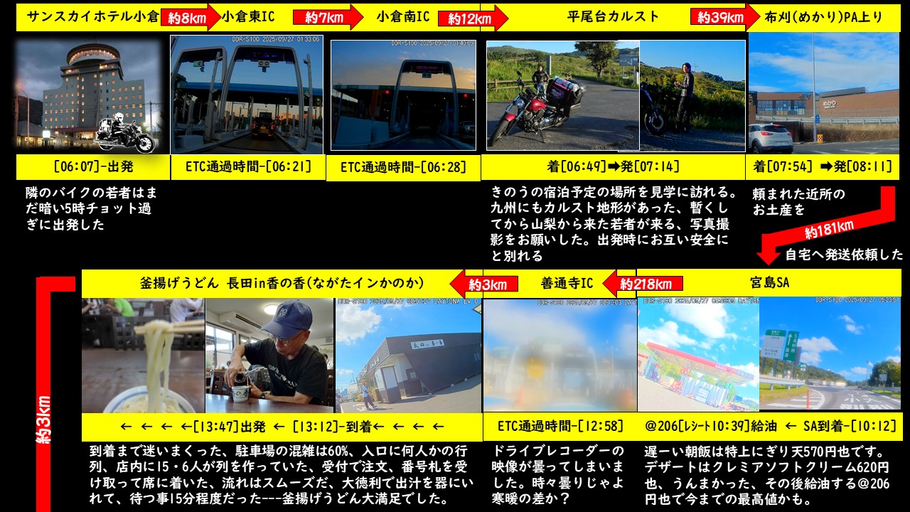 今朝は4時半に目覚めた、部屋(6階)から窓の外を覗くと真っ暗で街の灯しか見えない。5時に部屋の荷物を持って1階の駐車場に向かった、もう一台のバイクが出発間際だった、早っ!!---まだ外は暗いのに。ヘルメットをかぶっていたので年齢不詳、頭を下げて元気よく走って行った(忙しそうな走り方は若者のようだった)。駐車場の灯りの下で自分も荷物をバイクに積み込んだ。その後、部屋に戻ってTVを見ながら明るくなるのを待った。明るくなってからフロントで精算する、ルームチャージ5,800円・宿泊税200円・消費税527円、ネット予約だったのでJTBクーポン116円の割引で素泊まり合計5,884円でした。今日最初の目的地はきのう泊まる予定だった目白洞キャンプ場付近で平尾台カルストだ。ホテルを出たのは明るくなった[06:07]です。小倉東IC[06:21]で九州自動車道に乗り小倉南IC[06:28]で高速を降りて一般道に、国道333号線と県道28号線を利用して平尾台に到着した。駐車するのに程よい場所が有ったのでバイクを停めてテクテクと周りを眺める[06:49]、平尾台は日本三大カルストの一つで壮大なカルスト台地だ( ①秋吉台 ②四国カルスト ③平尾台 )、無数の柱状石灰岩は羊の群れのように見えるので羊群原(ようぐんばる)と言われて有名。[07:07]ソロツーリングの若者が同じ場所に駐車した、自撮りしていたので私が撮りましょうと言ってスマホを借りて撮影、その後に私もマイ-スマホで撮影してもらった。彼は山梨を出発して横須賀港と新門司港間をフェリー利用してココに来たそうだ、これから九州の所々を観光予定だと言っていた。私はこれから四国に行くなどの話をする、お互いの無事を祈ってお先に失礼した[07:13]発。目的地はうどん県です、去年四国を訪れた時にうどん県のうどんを食べ損なったのて今回は必須案件なのだ。小倉南ICで九州自動車道に乗る[07:33]➡関門自動車道➡///カミさんからのlineで近所からお裾分けを戴いたのでお土産を買ってきて欲しいと頼まれていたのを思い出した///「めかりPA」(福岡県北九州市)に立ち寄り[07:54]、売店で九州名物を教えてもらって数軒分の土産を購入し自宅に送ってもらった➡用事を済ませて目的地へ出発[08:11]➡関門橋[08:13]➡関門自動車道➡下関IC付近で➡中国自動車道➡山陽自動車➡宮島SA(休憩)[給油-10:39](広島県廿日市市)➡山陽自動車➡瀬戸中央自動車道➡瀬戸大橋(香川県)➡善通寺IC[12:58]ETC通過(香川県)➡一般道へ・少し迷ったが「長田in香の香」に着いた[13:12]。ネットの事前調査でこの店は超有名なうどん店だった。広い駐車場は見た目駐車率60%、店内に入ると順番待ちで16人程度だった。前払い制で「釜揚げうどんと混ぜご飯」を混ぜご飯は売れ切れで釜揚げうどんだけ注文した、番号札を受け取って席に着く、大徳利に入った出汁を器に入れ15分程度待つ、暇なので器の出汁を一口、カツオ節と昆布等の風味でおます、うどん県の「釜揚げうどん」がやってきました。丼からほんわかと湯気が立ち昇っていかにもうんまそう、丼にはゆで汁に太めのうどん、箸をとって器の出汁に付けてすする、麺はツルツルのプルプルでおます、釜揚げ-うんまい-小シコシコであっという間に完食(750円)、大盛を注文すれば良かった、ついでにうどん2袋を土産に買った。腹ごなしを済ませて次なるところに出発[13:47]。次なる所は四国八十八ケ所の最終の寺「結願(けちがん)の霊場 大窪寺(おおくぼじ)」です。長田in香の香➡善通寺IC➡高松中央IC➡「大窪寺」第一駐車場に到着した[15:01]。駐車場には数台の車と一際目立つ黄色のバイク1台が駐車中だった。上り勾配を進むと左側に入った所が納経堂、そこで御朱印の受付をして本堂に参拝してチョット境内をブラリとした、ひときわ目立つ大木のイチョウが本堂を見下ろしている。この大イチョウは樹高25~26m、幹回り6.5~7.2mで香川県の保存木となっている。納経堂で御朱印帳を戴いて駐車場に戻る。駐車場出発[15:31]今からキャンプ場へ約20km先だ、国道377号➡(民家はあるが道路の両側は山林が続く)➡県道129号を走り「とらまる公園」の大駐車場に到着した[15:56]。公園が広いので受付(体育館)が分からないので「とらまる公園案内図」の看板を見て見当をつけて大駐車場を移動、体育館に近いのは北駐車場のようだ、到着[16:05]。北駐車場から体育館までは思っていたより距離があった。事務所の入口付近は足場が組んであり、なお分かりにくかった。小窓超しにスタッフに挨拶して書類に必要事項を記入して使用許可書を受け取った。テント設営後に「翼山温泉」に行く予定だと話すと親切にもう少し近くに温泉施設があることを教えてくれた、とらまる公園の周辺地図を貰って北駐車場に戻り[16:21]説明されたテント設営場所に向かう向かう、到着[16:23]。遊歩道のソバだったのでキャンプ道具一式を運ぶのは容易だった。テント設営を済ませて温泉施設に向かう出発[1742]「温泉施設ベッセルおうち」は瀬戸内海に面した約1万坪の敷地を持つリゾートだキ