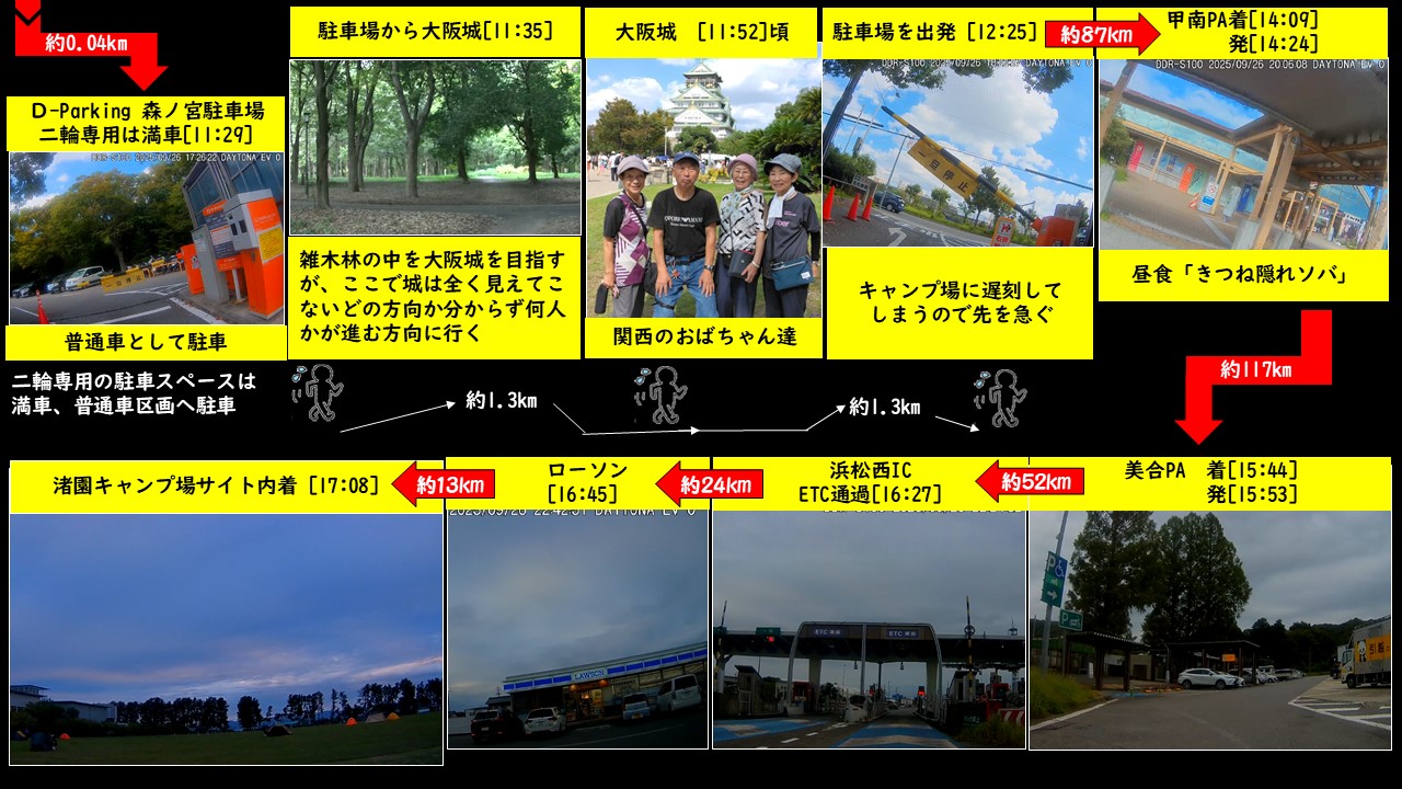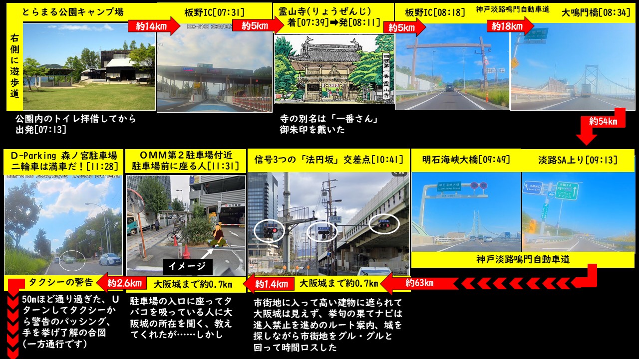 4時30分頃起床、テント内のシュラフその他の荷物をまとめ始める--->概ね荷造りは完了。キャンプ場の奥まった所に管理棟があるので歯磨きと顔洗い、トイレがあるか探したが見当たらなかった。遊歩道に駐車していたバイクに荷物を載せていると散歩中のシニア夫婦が話しかけてきてバイクのナンバーを見て「とちぎはどこから来ました?」と尋ねてきた、「栃木市と言って栃木県の左下(南西部)にある街。いくつか大きな蔵が並んでいて「蔵の街とちぎ」のキャッチコピーで集客している街」と答えた、色々話しているうちに奥さんが大田原の親戚に数回行ったことがあるようで「とちぎ」の文字が懐かしくて声掛けしたようだった。話が済んで仲の良い夫婦は上り勾配のある遊歩道をゆっくりと歩いて行った。積み荷が中途半端だったが一応は「とらまる公園キャンプ場」の様子をビデオ撮影しようと思い真ん中に行ってぐるっと一回転して全体を撮影した[05:54]。再度トイレを探したがキャンプ場付近にトイレはついぞ見つからず諦めた。荷物を積んで出発準備OK、まず北駐車場に行ってゴミの処分[06:17]、次は正面入り口に行って「とらまる公園案内図」でトイレの位置を探した、良かった近い場所にありました[06:19]。用足しが済んで最初の目的地をナビに設定、行先は約20km先の四国八十八ケ所巡りの「霊山寺(りょうぜんじ)」です、一番札所のため親しみを込めて「一番さん」とも呼ばれている。とらまる公園を出発[07:13]➡白鳥大内ICから高速へ[ETC通過-07:17]➡高松道➡板野IC-[ETC通過-07:31]一般道➡霊山寺到着[07:39]、霊山寺の入口付近が横断歩道のためボランティアのパパさんたちが交通整理をしていました、折しも通学時間帯だす。少し先に大駐車場の案内板がありそこにバイクを駐車した。境内をキョロキョロ・・・納経堂のベンチで何か書き物をしている人・二重の塔・仁王門・本堂の前で何かをする巡礼者、本堂の引き戸は左右1枚が戸閉してなかった、半開き状態だったので中の様子は窺(うかが)えた[07:50]。本堂前にいるお遍路さんに参拝はしたのか聞くと「ここは時間キッチリなので参拝は8時から」と言った、ネットでは参拝は7時からとなっていたが・・・。8時頃にひょっこりお婆ちゃんが現れて本堂の引き戸を全開にした[07:58]、近寄って「参拝して大丈夫ですか?」と聞くと「どうぞ・どうぞ」と言ってくれた。お言葉に甘えて心の中で願い事を唱えて合掌した。納経堂ではお遍路のアイテム等を数多く扱っていて、二人連れの外人さんが品定め中でした。御朱印受付もここでやっているので御朱印帳を出してお願いした「お参りは済ませましたか」と聞かれ「先ほど本堂で済ませてきました」と言うと、目の前で直書きした御朱印を戴いた。きのうは第88番札所の「大窪寺」きょうは第1番札所の「霊山寺」だ。「88番札所から1番札所への巡礼」は逆打ちと言うらしい、うるう年に周れば3倍のご利益があると言われる。今回は逆打ち・・・と書きたい所だが完全に「キセル逆打ち」で論外。次の目的地は「大阪城」です、去年も「大阪城」を目指したが遠くで見えた大阪城が市街地に入るとビルの影で見えなくなりナビにグルグルと同じようなルートを案内され、とうとう諦めたという経緯がある。今回は多少のグルグルは覚悟で「何としても行くで!」である。「霊山寺」からの走行ルートは➡「大鳴門橋」➡淡路島➡「淡路SA・休憩・前回は下り線だった」➡「明石海峡大橋」➡<<大阪城見学>>➡「甲南PA・昼食」➡「美合PA・休憩」➡「浜松西IC」➡「ローソン浜松雄踏宇佐美店」➡「渚園キャンプ場」だ。霊山寺でのナビ設定は大阪城の「住所」にして出発した。神戸淡路鳴門自動車道から垂水JCTで阪神高速に入る阪神高速13号東大阪線の法円坂料金所で高速道を降りて一般道へ、法円坂交差点に差し掛かったところで信号待ちとなった、その正面には3個の信号がある、バイクの停車位置から数十mある信号機の文字は読めなかった。どの信号を見たらいいのか分からず焦りまくった、とりあえず真正面の信号を見る、青信号になった一呼吸置いて左右の状況を確認し徐行して左折した(冷や汗😅)。この場所を自宅に戻ってからネットの-Google-Maps-を使って調べました、結果は左から「時差信号」「平面道路用」「高架道路用」だった。左折してから大阪府警本部の前(上町筋通り)を走行、街の中はさすがに混雑、(--肝心な時にナビの画面がフリーズしてしまった--)信号機で止まるごとに信号待ちだ、脇道を通って迂回、168号線に面した「OO(オーオー)M第2駐車場」を左折して細い脇道に入り人に聞くことにした。脇道に面した駐車場の入口ゲートの所に座ってタバコを吸っている人が居たので「大阪城」の場所を尋ねた、おもむろに立ち上がってタバコを咥え暫く考えて-->(もったいぶらずに早く教えてチョー)<--「この辺は高層ビルが続くので道路から城は見えないんだよなー」--->(分かっておりゃーす)<---「この大通りを暫